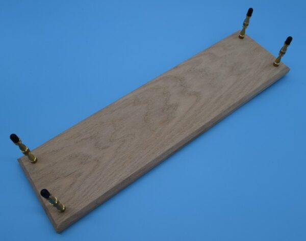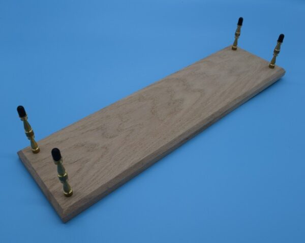 This wooden display stand features a predrilled and beveled unfinished 3/4″ red oak base, solid brass spindles and molded rubber protective caps. Holes are drilled (and countersunk) 1″ in from each corner. Included with the base are two tall (3-1/2″) brass pedestals, two shorter (3″) brass pedestals, four flat head screws, four rubber protective caps.
