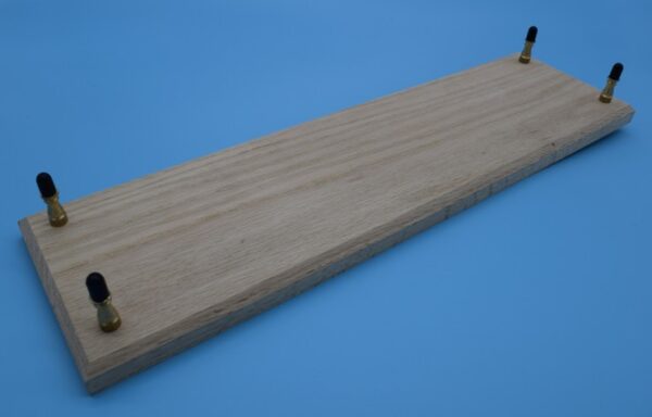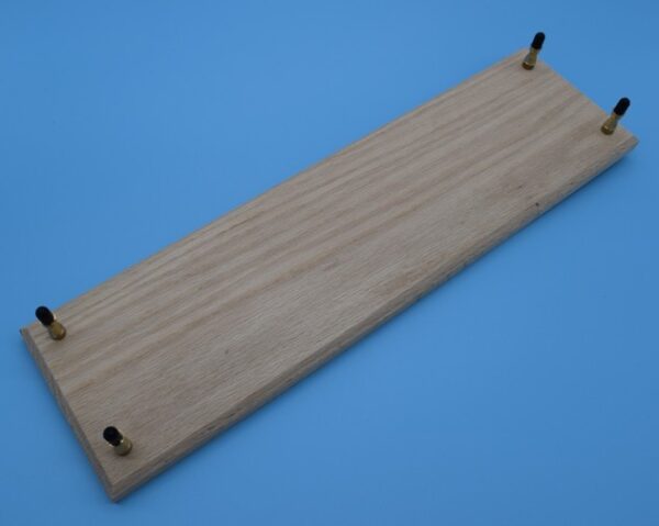 This wooden display stand features a predrilled and beveled unfinished 3/4″ red oak base, solid brass spindles and molded rubber protective caps. Holes are drilled (and countersunk) 1″ in from each corner. Included with the base are four (1-1/2″) brass pedestals, four flat head screws, four rubber protective caps.