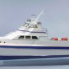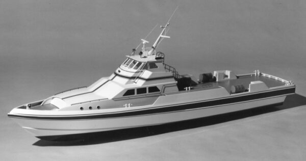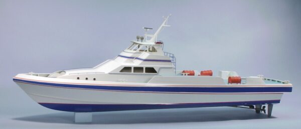 From Halter Marine comes an experimental craft for the hard working commuter. The American Enterprise was a trial balloon constructed for carrying crews and supplies to and from off shore oil drilling rigs. The goal of the Enterprise was to get there and back in a hurry regardless of the weather conditions. To accomplish this task she was equipped with a high speed 24 in. water jet powered by a gas turbine. When they were feeling a bit more leisurely they switched to the 16 in. water jets powered by the two Detroit Diesels. Here is your chance to own a crew ship of your own. This all wood kit is engineered out of top grade birch and poplar plywood, precision die-cut for an exacting fit. A 27 piece cast fittings set is included, as well as many other detail items. The Enterprise runs beautifully as a scale model with two Dumas #2004 electric motors. But her sleek lines may make you want to push her to the limit. Perfectly suited for twin high speed electric or two gas engines.