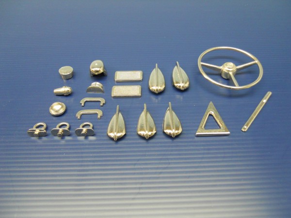 This fitting bag is used for the 1955 Chris-Craft Cobra and similar models. It contains 20 cast metal parts that have been chrome barrel plated.