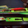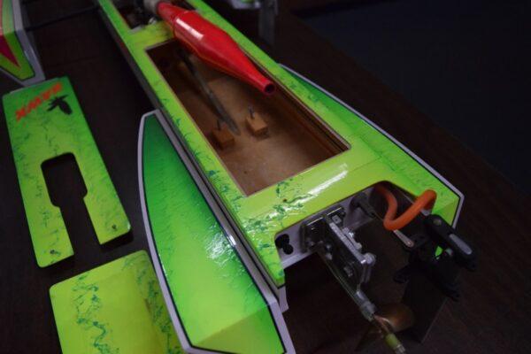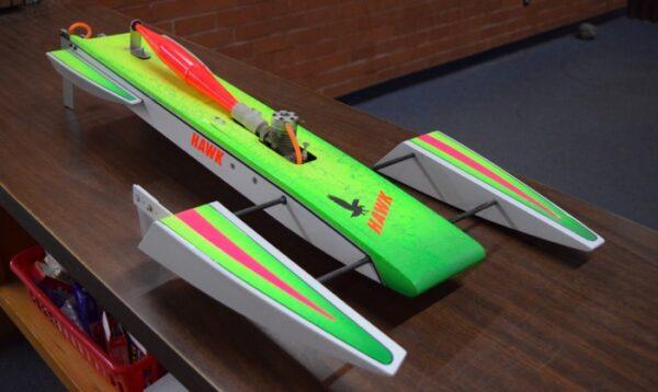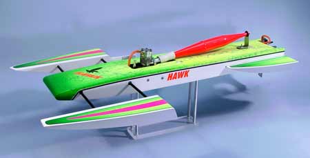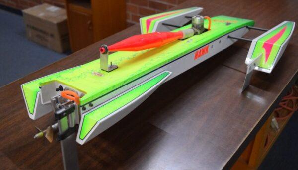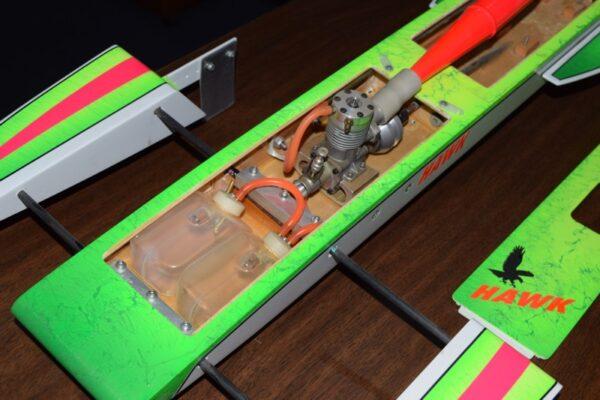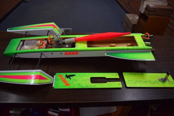 Here is rare opportunity to purchase one of our original show models. The Hawk Hydroplane, designed by champion racer Gary Preusse, is chock full of racer friendly features. The boat is constructed birch plywood and foam and features a custom paint scheme from one of our past designers. The engine is a K&B 3.5cc it was new when installed but has not been run for approximately 20 years. This is being sold as is with no returns.