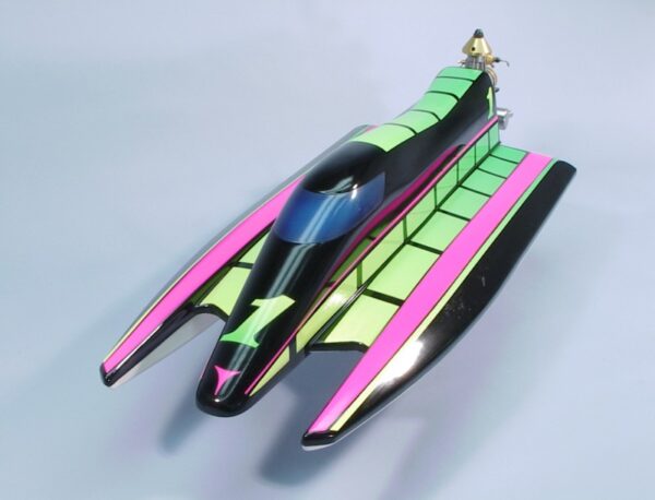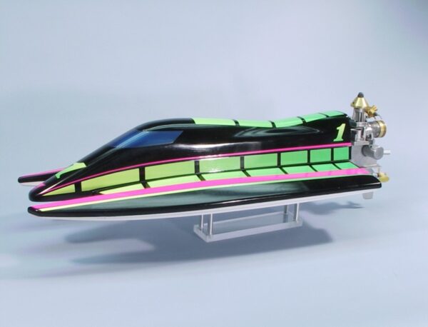 This 24 in. tunnel hull is a water ripper that is sure to please everyone, beginner and pro alike. This kit features precision die-cut plywood con-struction and a preformed ABS cowl. Step by step instructions with lots of photos and a complete plan set that makes building a SNAP. We have even included the building jig, complete steering and throttle linkage in the kit! You’re two feet ahead of the competition with the Dumas HOT SHOT SPRINT 3.5.